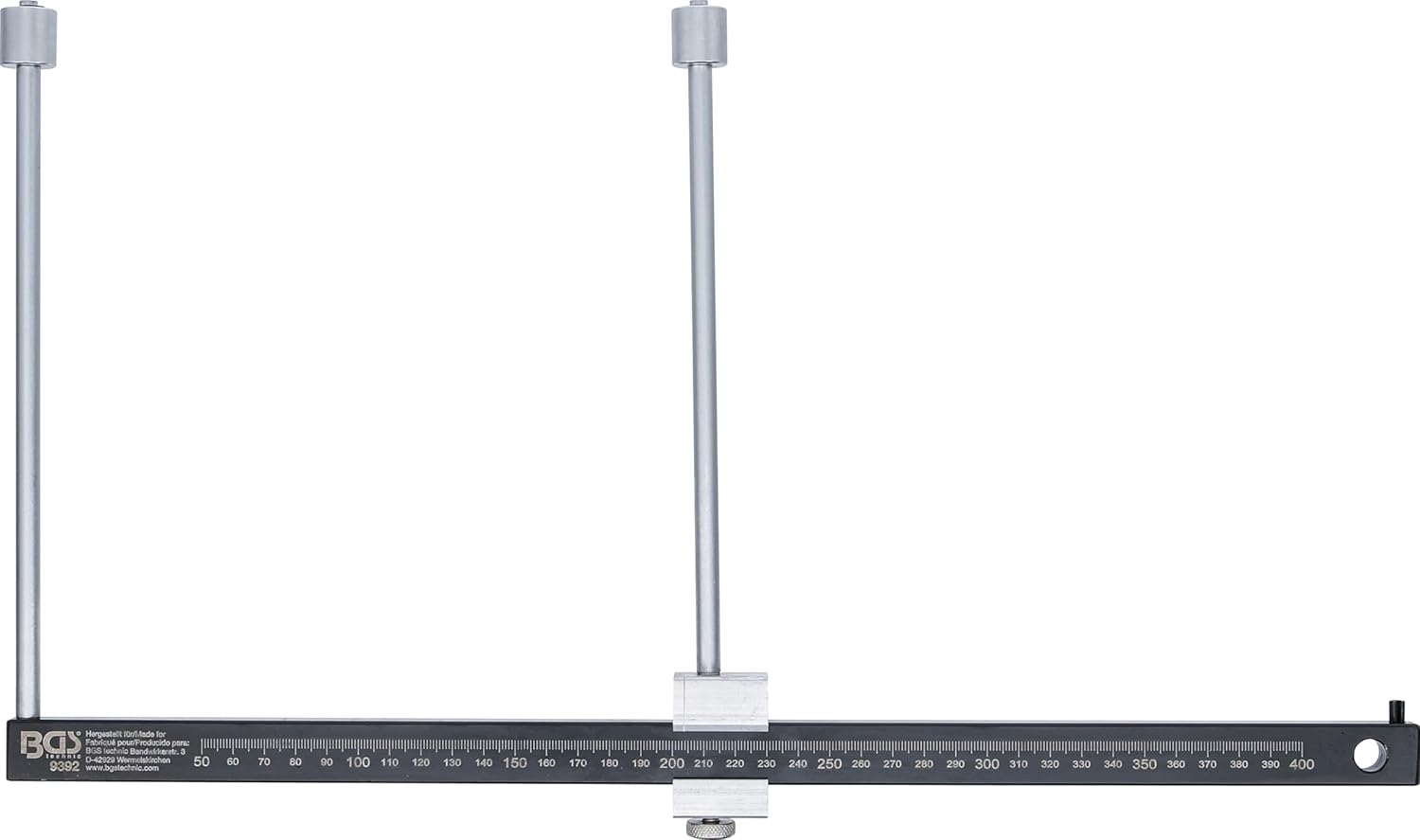 For measuring the brake disc diameter. Without disassembly of the wheels. Allows quick and efficient identification of the braking system and reduces the danger Incorrect replacement parts orders Universal use Total length: 455 mm Measuring range: 200 - 400 mm Gross weight: 1300 g