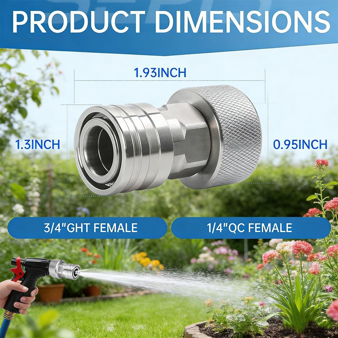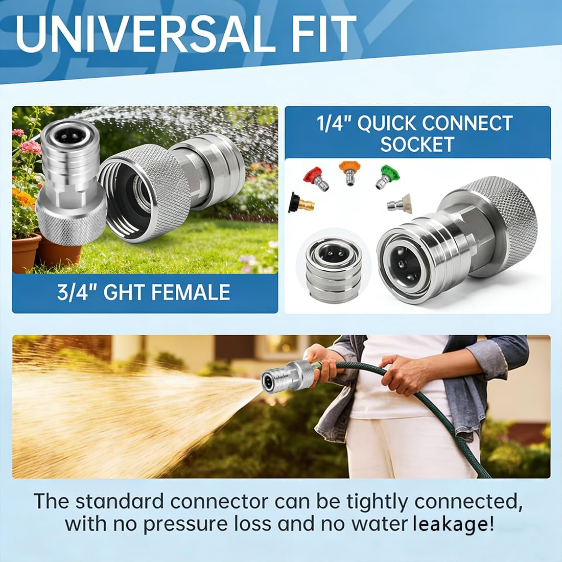 Q: Will this adapter work with my existing pressure washer hose?A: It is designed to connect a standard garden hose (3/4") to a mini pressure washer or accessory with a 1/4" quick-connect fittingQ: Do I need any sealant tape or tools for installation?A: No tools or tape are required. The precision threads create a watertight seal when hand-tightened. Simply screw it onto your garden hose and click it into your pressure washer—no extra steps neededFeatures:1.Rust-resistant stainless steel construction2.Hand-tighten installation, no tools required3.Leak-proof seal prevents water waste4.Converts garden hose to pressure washer use5.Standard 3/4" GHT to 1/4" quick-connect compatibilitySpecifications:Name: Mini Power Washer AdapterMaterial: Stainless steelSuitable for: Garden hosesWeight: 100gHose connection diameter: 3/4"Product Includes:1/2 PCS * Mini Power Washer Adapter1 Pair * GlovesNote:1.There may be slight differences in dimensions due to manual measurements2.The actual color of the product may appear slightly different from the images due to variations in monitor settings and lighting conditions