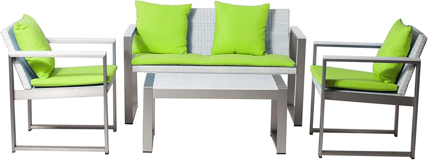 4 piece outdoor lounge set. This set comes with 2 arm sofa chairs, 1 two- seater, and 1 coffee table. You will love this set for its mix of rattan and upholstery. All pillows and cushions are removable. So, create the look you love. Seat Height is 18 inches. Arm Height is 25 inches; cushion Thickness: 2 inches