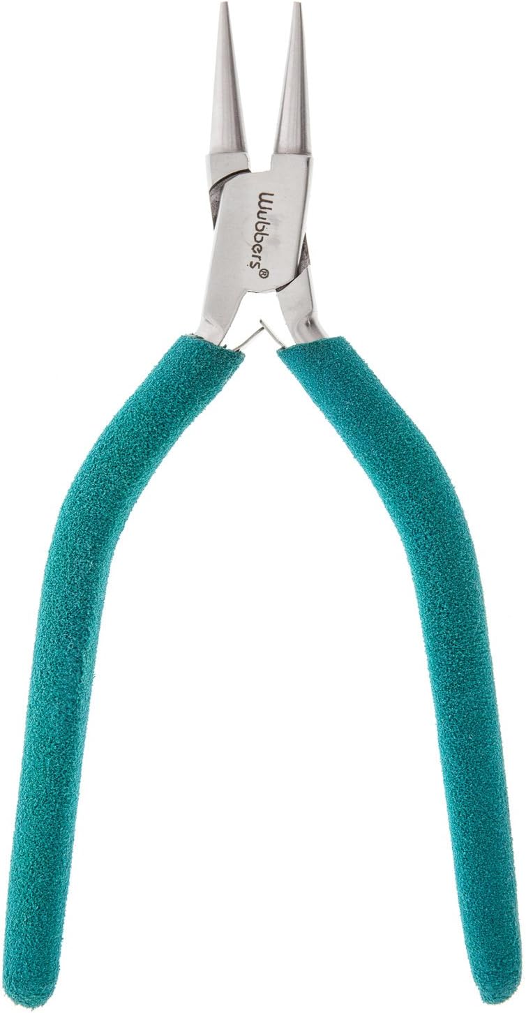 Classic Wubbers Round Nose Pliers are perfect when working on jewelry crafts especially when making loops in wire. Wubbers are made with long, cushioned, turquoise handles that fit perfectly in your hand. They provide great leverage without the added bulk and feature smooth-action springs. These pliers can handle 12 to 28 gauge wire. 6-1/2" long with 25mm long jaws and a 1.5mm wide jaw tip.