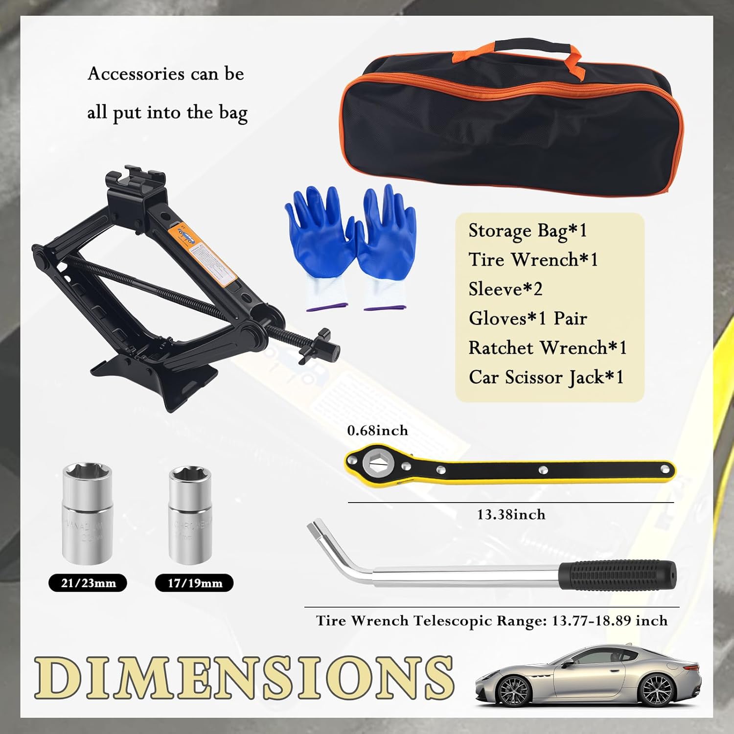 CAR SCISSOR JACK KIT, PROVIDES STABLE CAR LIFTING PROCESS, EASY TIRE CHANGINGProduct AttributesColors: BlackSizes: Car Scissor Jack: Length: 16.73 inch, Base Width: 4.96 inchLift Height Range: 3.93-15.35 inch (100-390 mm)Weight Capacity: 2TRatchet Wrench Length: 13.38 inchTire Wrench Telescopic Range: 13.77-18.89 inchSleeve Specification: 17/19 mm, 21/23 mmWeight: 116 ozMaterial: SPCCPackaging: Storage Bag*1, Tire Wrench*1, Sleeve*2, Gloves*1 Pair, Ratchet Wrench*1, Car Scissor Jack*1Product Functions & Features1. Our car scissor jack has a load capacity of 2T, which is recommended for cars and SUVs, not for trucks and vans2. Large base design, larger contact area with the ground, SPCC material car tire jack, can maintain good anti-bending and anti-fatigue performance under constant heavy loads3. The tire wrench inside the package is used with sockets to easily detach car tire fasteners. 2 sockets can match to 4 sizes of fasteners. Retractable tire wrench with adjustable wrench length based on fastener tightnessProduct Installation1. Park the vehicle on a flat surface2. Place the car scissor jack on the bottom of the vehicle, locate and align the bottom support point3. Use the ratchet to drive the jack and complete the lift4. Use the tire wrench to disassemble the tire fasteners and change the tire