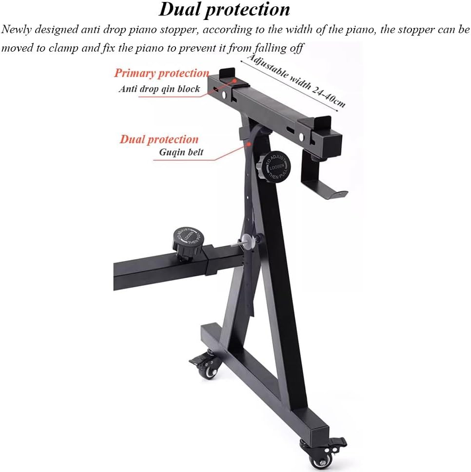 ➤ Equipped with universal pulleys, high-end universal piano frame, anti drop stop, stable and not wobbling➤ Dual ProtectionNew design of anti drop qin stop, which can be moved according to the width of the qin to clamp and fix the qin, preventing the beloved qin from falling off➤ SpecificationsProduct name: High end universal piano standMaterial: High strength steelPackaging size: 56.6x48x9.5cmProduct weight: approximately 7.5KGSuitable for electronic organs, electric pianos, guzheng, synthesizers➤ Product List:Keyboard Stand x1(Includes installation accessories)➤ Service: If the product has any quality problems, or if you think the product is inconsistent with our description, please feel free to contact us, We will provide you with a satisfactory solu