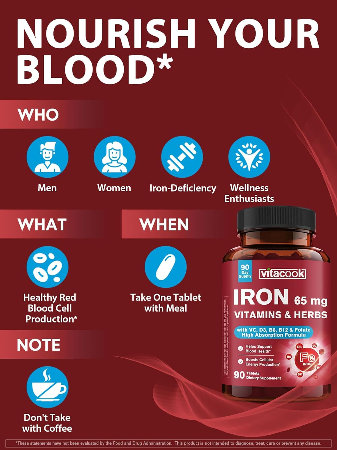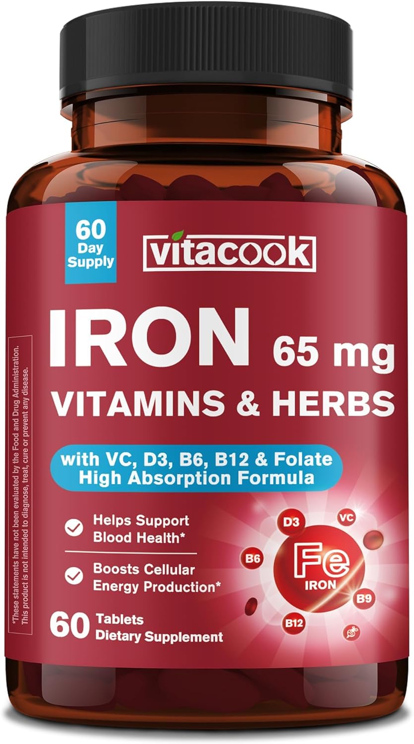 Rediscover your inner strength with Vitacook Iron Complex, a complete iron formula designed to replenish essential nutrients and promote whole-body wellness.* Combining high-potency iron with supportive vitamins and a nutrient-rich botanical blend, this formula helps maintain energy levels, oxygen transport, and immune balance.*Why Choose Us?Iron Supplement:65 mg of Elemental IronVitamin D3, B6, Folate & Methyl B12Whole Food & Herbal BlendWith Vitamin C for Better AbsorptionNon-GMOOnce DailyEasy to Swallow What Are the Benefits?Supports Red Blood Cell Function*Boosts Energy Metabolism*Promotes Immune Health*Enhances Blood Flow*Products You Can TrustAll our products are non-GMO and do not contain gluten, soy, milk, eggs, fish, shellfish, wheat, peanuts, artificial flavors, unnecessary binders, or preservatives.Lab Tested & Made in USALab tested for purity and quality and made in USA in a GMP-compliant facility.Our MissionOur mission is to deliver the highest quality dietary supplements for you and your loved ones to live happier lives.