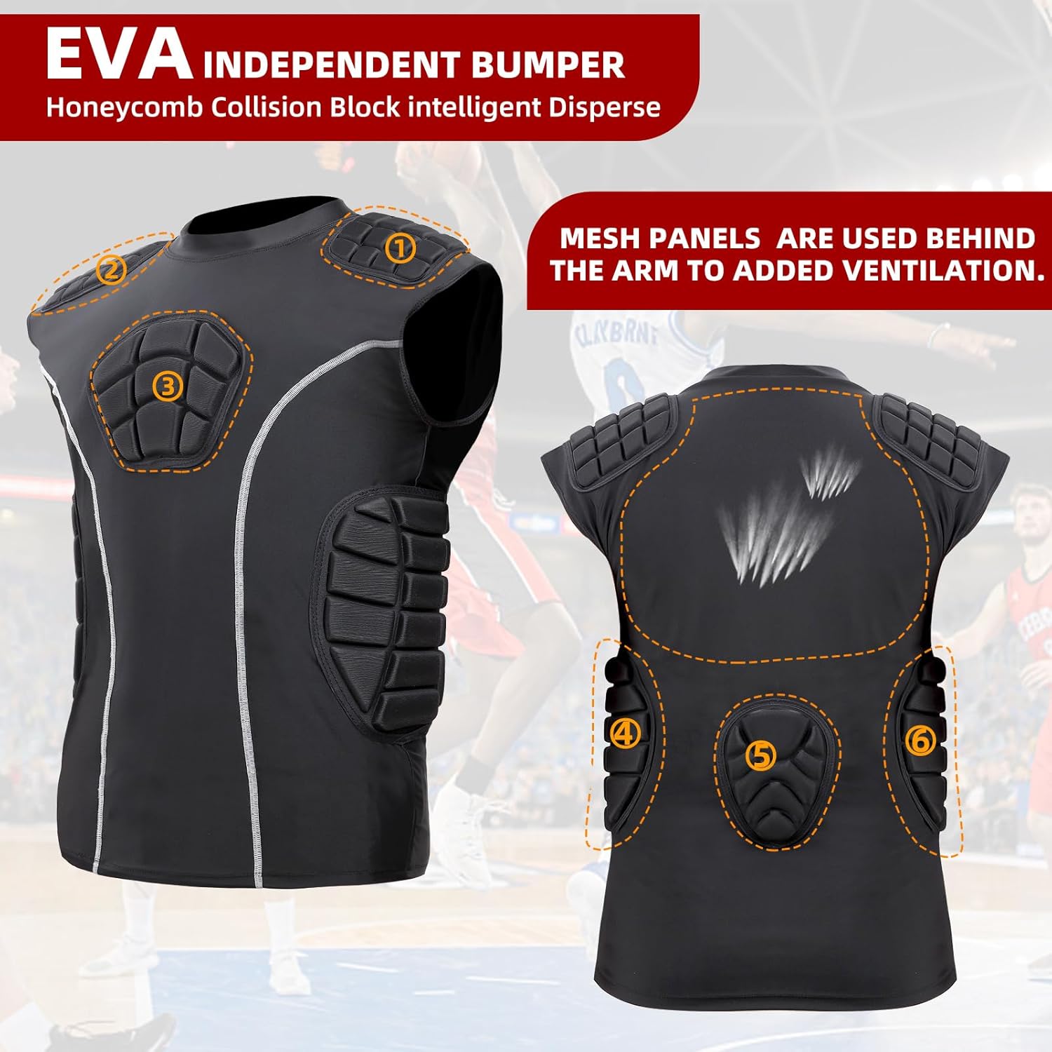 Zicac Men's Padded Compression Shirt 8- Protective Pads Football Rib Protectors Chest Rib Protective Gear Heart Rash Guards for Football Baseball Paintball Features:High elastic sweat wicking fabric, UV Protection, anti-collision particles ofpolyethylene EVA, comfortable to wear.Unique hexagonal breathable pad, effectively slow and evenly disperse impact.Padded compression shock guard shirt, perfect for football, basketball, rugby,soccer, paintball and other contact sports.Specifications:Material: polyester + spandex + EVA foamColor: Black White,Black Red,Grayish GreenPackage: 1 x Padded ShirtSize: (Asia Tag M): Length: 26inch, Chest:34-36inch, Recommended height:5.1-5.4ft, weight: 99-143lb(Asia Tag L): Length: 26.8inch, Chest:36-38inch, Recommended height:5.4-5.7ft, weight: 143-165lb(Asia Tag XL): Length: 27.6inch, Chest:38-40inch, Recommended height: 5.7-6.1ft, weight: 165-187lb(Asia Tag XXL): Length: 28.3inch, Chest:40-42inch, Recommended height:6.1-6.4ft, weight:187-209lbCompression padded shirt football rib protectors football padded shirts chest protector padded shirt protective Gear baseball rugby basketball